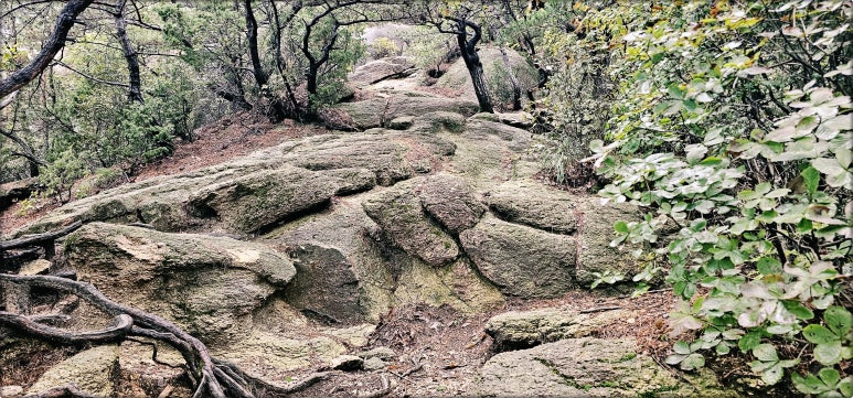 기차바위, 깔닥고개 갈림길 협수곡에 어렵사리 도착