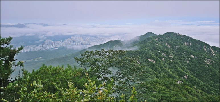 운해를 뚫고 우뚝 선 북한산 도봉산 라인이 환상이다.