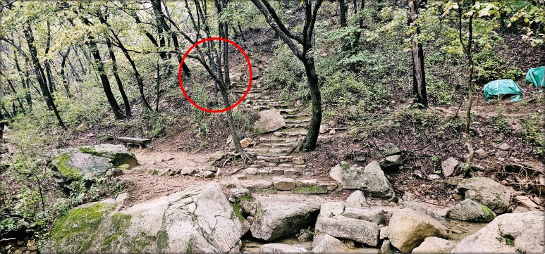 왼쪽 길로 합류할 수 있으나 급경사 바윗길에 물기가 있어 포기하고