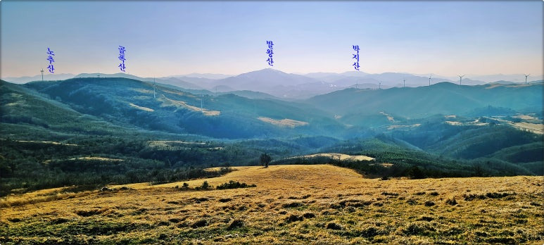 황금빛 초원 뒤로 늘어선 산줄기 강릉의 칠성산과 동해의 두타산 청옥산.